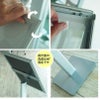 スナップ式アルミフレームのスナップ案内板A4。フロントオープンで簡単に中身の入れ替えができます。ボード面はタテ位置でもヨコ位置でもどちらでも使えます。ボード面の角度は約60°で固定です。表面保護用の透明カバーが付いています。