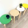 ナチュラルウッドの脚部にポップなイエローの座面がアクセントの木製ラウンドスツール。座面直径は340mm、脚裏には床のキズ防止用にフェルトが貼ってあります。4脚までスタッキングできます。