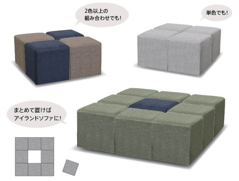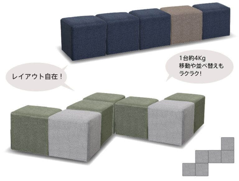 リコ キューブソファは、1台約4Kgと軽量で、移動やレイアウト変更も手軽に行えます。単体使用のほか、複数をストレートやジグザグなどお好みの形状に並べてラウンジや待合スペースのベンチのようにもご利用いただけます。 |