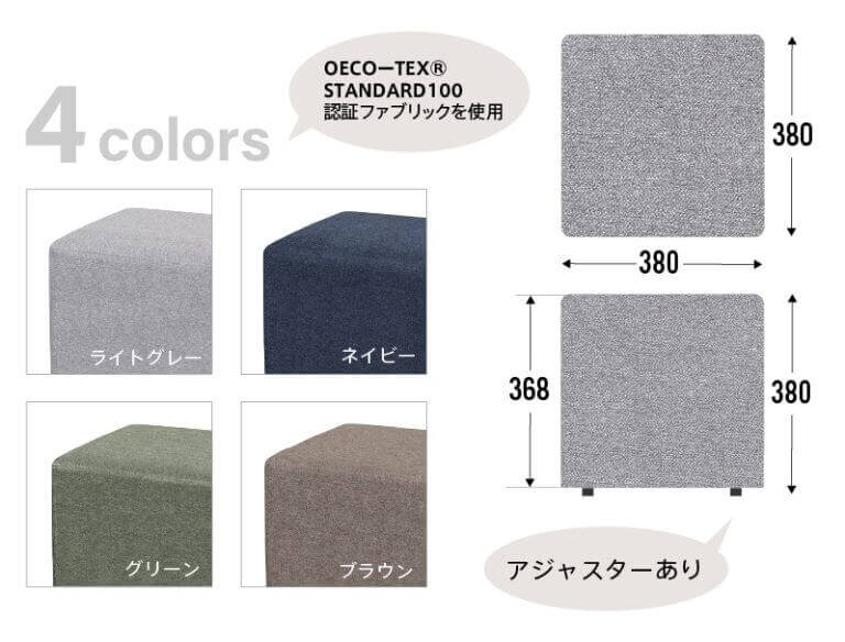 Recoキューブソファの張地には、エコテックス®スタンダード100認証のファブリックを使用しています。落ち着いた色目で馴染みやすい4色のカラー展開で、空間のイメージに合わせてお選びいただけます。 |