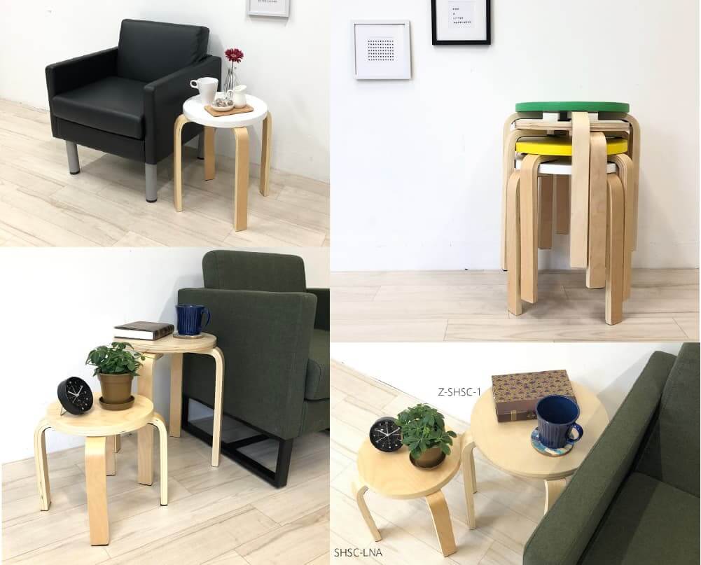 ラウンドスツールは、4脚までスタッキングして保管できます。座面はフラットでサイドテーブルとしてもご利用いただけます。 |
