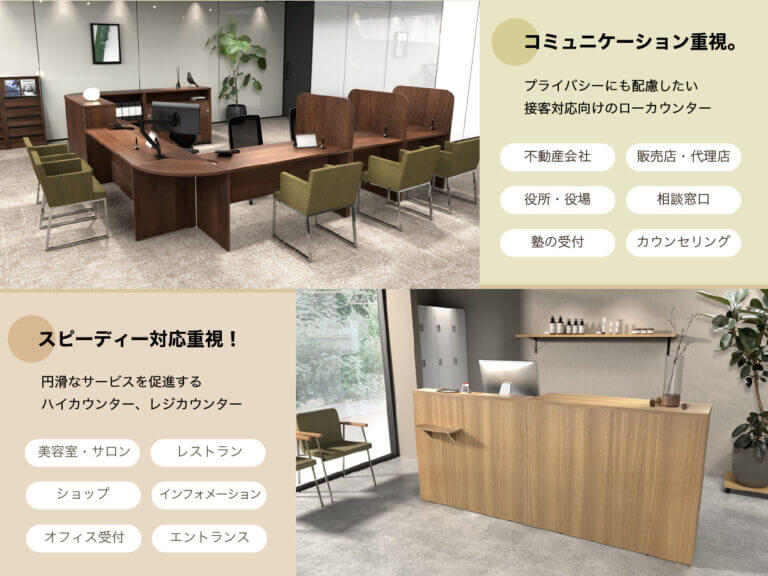 テンポシリーズは、ハイカウンター、ローカウンター、レジカウンターの3タイプを完備。各タイプ幅・奥行き、また書庫型などのバリエーションをご用意しています。スピーディー対応重視の受付にはハイカウンター、相談・カウンセリング等コミュニケーション重視にはローカウンター、お会計専用にはレジカウンターなど目的に応じて選べ、また組み合わせてレイアウトいただくことも可能です。