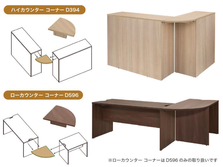 ハイカウンター(書庫型含む)とローカウンターD596には、それぞれコーナー用天板(別売)をご用意。ストレートのカウンター2台をL字に連結するコーナーレイアウトが可能です。テンポシリーズではコーナーを天板部分のみとし、従来品よりもコストパフォーマンスの高い設計となっています。