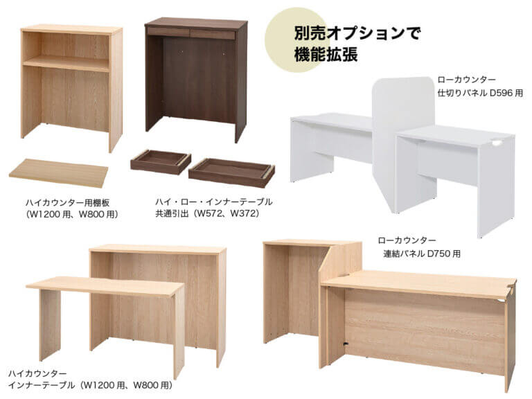 テンポシリーズは、ハイカウンター用インナーテーブル、棚板、ローカウンター用仕切りパネル(D596のみ)、連結パネル(D750のみ)などの別売オプションにより、用途やレイアウトに応じたカスタマイズが可能です。ハイ・ローカウンター、インナーテーブルに設置可能な共通引出(2サイズ)もご用意しています。適応サイズ、数については各商品ページをご確認ください。