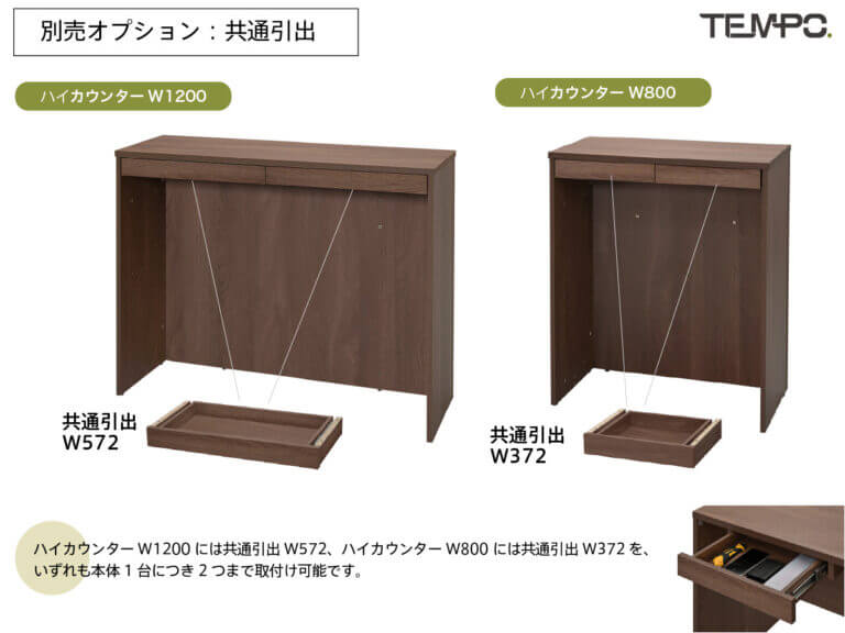 テンポ ハイカウンターW1200には共通引出W572を、ハイカウンターW800には共通引出W372を、それぞれ2つまで追加してご利用いただけます。 |