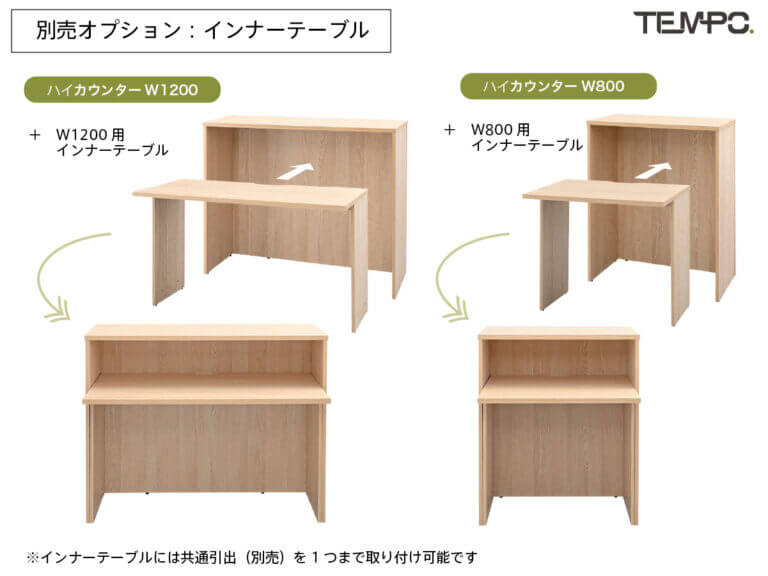 テンポ ハイカウンターW1200・W800の内側には、別売のインナーテーブルを組み合わせてご利用いただけます。インナーテーブルには共通引出の取り付けも可能です。 |