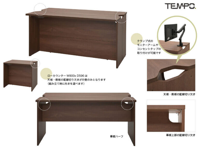 テンポシリーズのローカウンターW1800×D750。ゆったりサイズの天板奥行き750mmで、幕板は足元までしっかり隠れる標準タイプ。D750のローカウンターは幕板の奥行きを2段階で調節できお客様側の足元を広く確保するなど、車椅子をご利用の方にも配慮した設計になっています。下部幕板は後付け可能です。天板と幕板の両端に配線切り欠きがあり、クランプ式コンセントタップやモニターアームの設置にも対応できます。 テンポ ローカウンター(D750)のW1800・W1400は、複数台を並べて設置する際に本体同士を連結できます。別売の連結パネル(D750用)の追加でハイカウンターとも連結可能です。別売の共通引出(W572・W372)を追加してご利用いただけます。