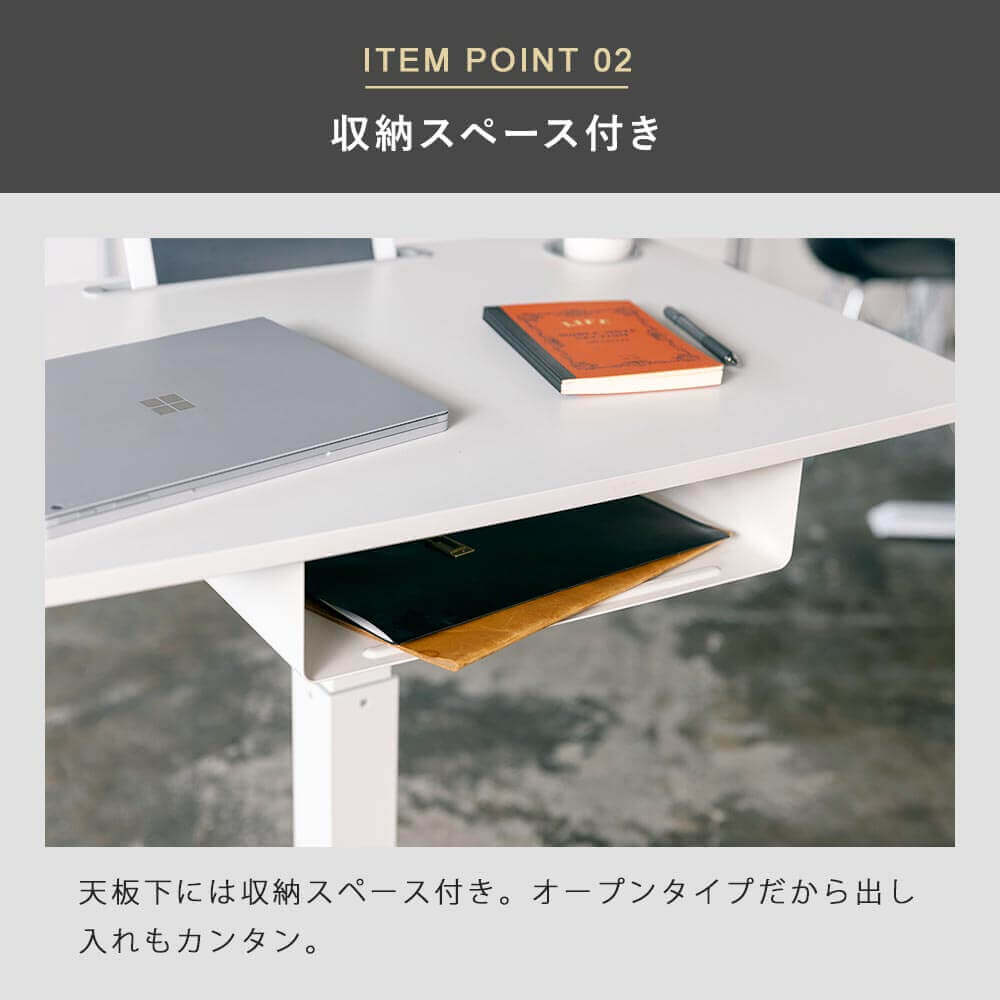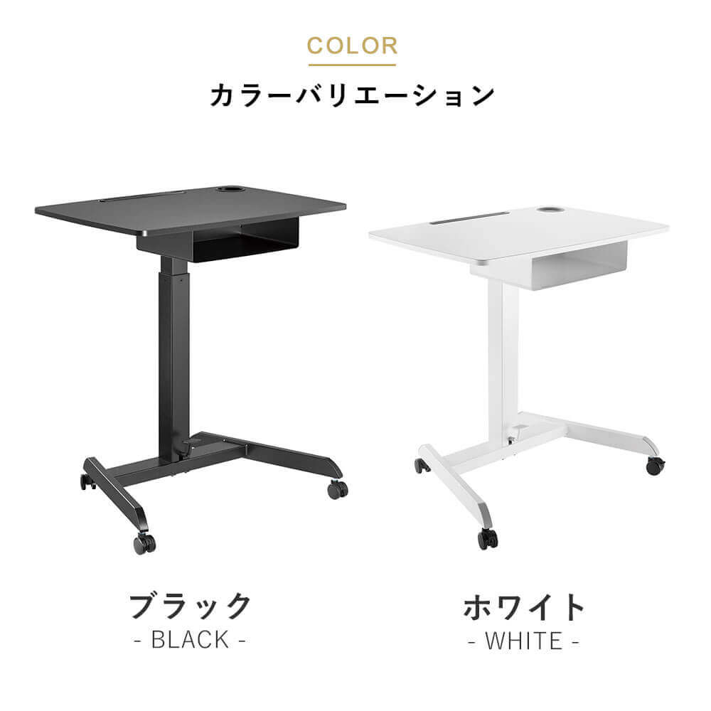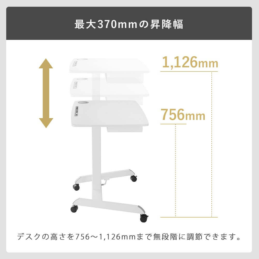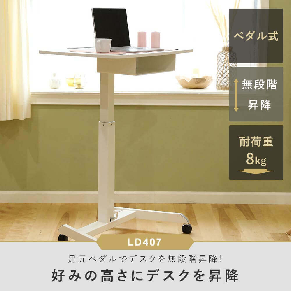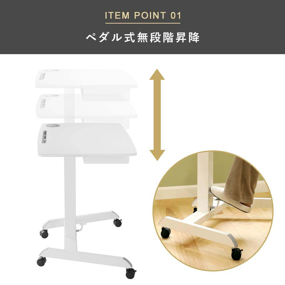 あると便利なちょうどいい大きさの昇降デスク。足踏みペダル式の昇降機能で高さ調節も簡単。