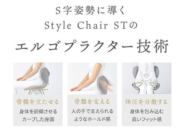 人間工学に基づく設計とカイロプラクティックのメソッドを融合させた「立てる」「支える」「分散する」の3つのポイントが、背骨がS字カーブを描く理想の“S字姿勢”をサポート。座ることで正しい姿勢をキープします。