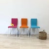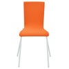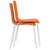 背と座面にウレタンクッションが入って座り心地のよいファブリックチェア。明るいオレンジにホワイトの脚が爽やかな印象です。スタッキングは4脚まで可能ですが、クッションに跡が残りますので長時間のスタッキングは避けてください。