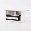 天板下をフル活用できる収納付きテーブル。天板は少し高めのH760mmで梱包や封入、資料作成などの軽作業にぴったり。4~6人のミーティングテーブルとしてもお使いいただけるサイズです。収納部には可動棚板2枚(各面1枚)付属、中央寄り64mmピッチ5段階からお好みの高さに設置できます。中央に取り付けた場合、A4サイズが2段に納まります。天板下収納上部に配線用の切り欠きがあります。耐荷重(均等分布):天板約100Kg、棚板20Kg