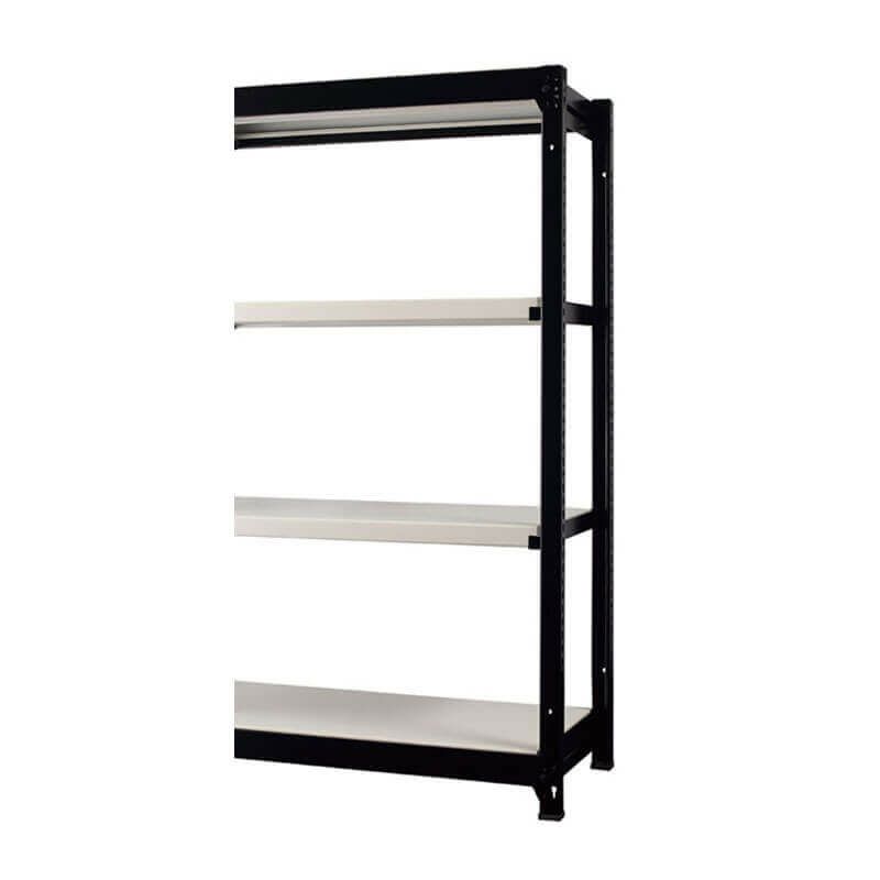 デザインにこだわったスチールラック増連セット。オールスチール製で1段あたり耐荷重200Kg(等分布)ボルトレスにより組立・分解も簡単。片側の支柱を利用し増連が可能。安全に配慮したコーナーキャップ付き。支柱2本・棚板4枚。