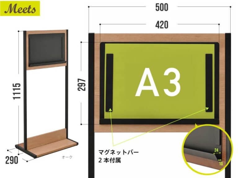A3横サイズの掲示に適した縦型の案内板。掲示面はスチール製で付属のマグネットバー2本を使った掲示が可能です。掲示面が傾斜した従来の案内板とは異なり、離れた位置からでも目につきやすい直立タイプ。掲示面下は受けになっており、厚み10mm程度のメニューや冊子を置くこともできます。ウッドとブラックの組み合わせでカジュアルながらも洗練されたデザイン。店頭やオフィスのエントランス等で上質な接客スペースを演出します。
