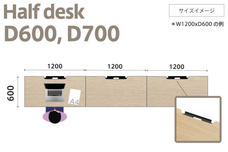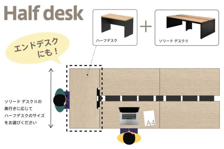 SOLIDOソリードシリーズのハーフタイプD700専用増連デスク。デスクの基本(W1400xD700、W2800xD700、W4200xD700)にこの増連デスクを追加することで最大幅7000mm(5台分)まで拡張できます。