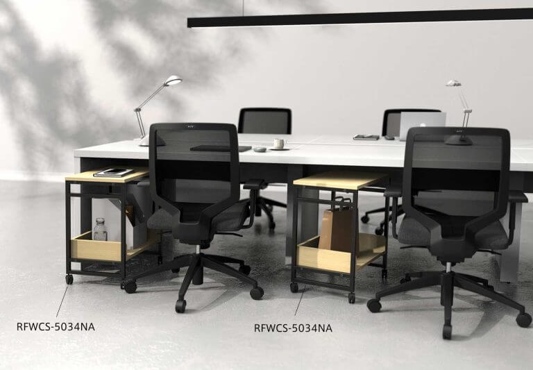 厚み40㎜の天板と脚部で構成された高級感のあるフリーアドレス用デスクです。1200㎜単位で天板の増減(最大W7200mm)が可能なため、人数やオフィス面積の変化にも柔軟に対応できます。天板中央には電源タップが収納できる配線受けを備え、中間脚によって床まで電源コードを通せるため足元もすっきり保ちます。天板下中央には足元隠しになる幕板があります。中央のスリット部にはクランプ式のモニターアーム等も取り付け可能。固定席デスクとしてもご利用いただけます。