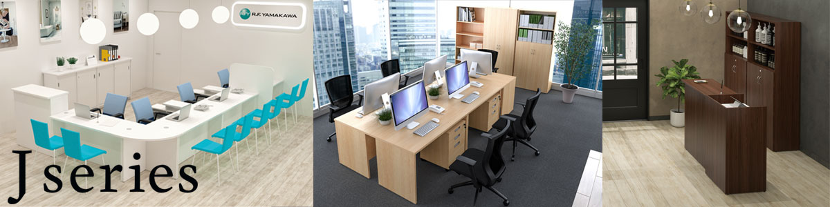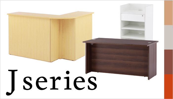 Jシリーズは、温かみのある木製のベーシックなシリーズ。デスク、シェルフ、カウンターと組み合わせて統一感のあるオフィス空間をトータルでコーディネートできます。オフィスのエントランスとワークスペース、クリニックや学習塾の受付と事務室、店舗の受付カウンターなど幅広くご利用いただけます。デスクは奥行が700mmと広めでPCなどのモニターも設置しやすいゆったりとしたサイズ感です。