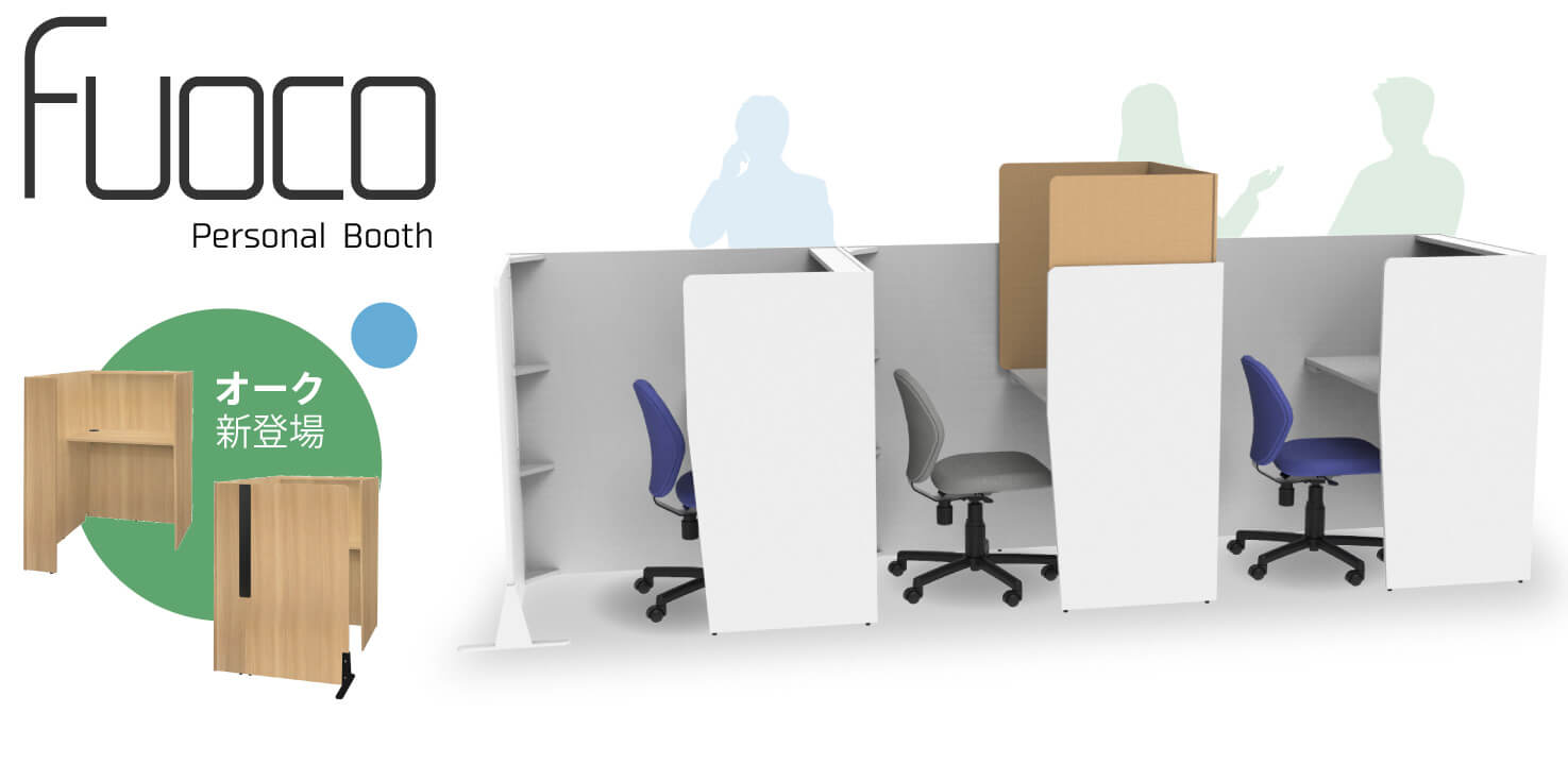 集中作業や個別のウェブ会議、個別学習塾などに適したfuoco(フォーコ)シリーズのパーソナル個別ブース。セミクローズを基本とし、エンドパネルをオプション化することでコストパフォーマンスに配慮しました。大掛かりな施工が不要な組み立て式で、小規模オフィスや賃貸スペースにも手軽に導入でき、レイアウト変更や追加導入にも対応しやすいフレキシブルなブースシステムです。パネルの高さをH1200mmと低めに設定したコンパクトなパーソナルブースのため部屋全体への圧迫感が少ないため天井の低いスモールオフィスや自習室にも設置しやすく、また使用時の閉塞感も抑えられ気軽に利用できます。