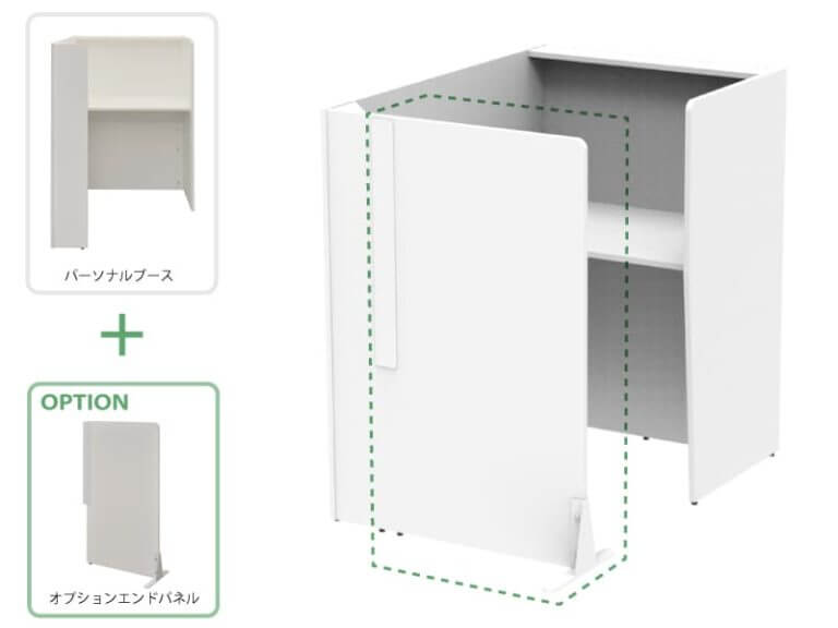 オプションエンドパネルは、組み立て済みパーソナルブースに差し込み式で簡単に取り付けが可能。複数レイアウトなら末端のブースのみに取り付けるなど、数や用途に合わせてご利用いただけます。床面への固定もないため、後からの追加やレイアウト変更も手軽に行えます。 |