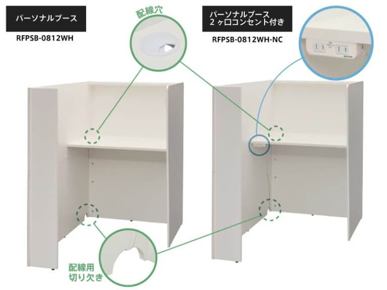 パーソナルブースは、天板にキャップ付き配線穴、天板下方には配線用切り欠きを標準装備しており、モニターやデスクライト等の設置に対応しています。また、天板左下にあらかじめ電源タップを備えた2ヶ口コンセント付きもお選びいただけます。 |