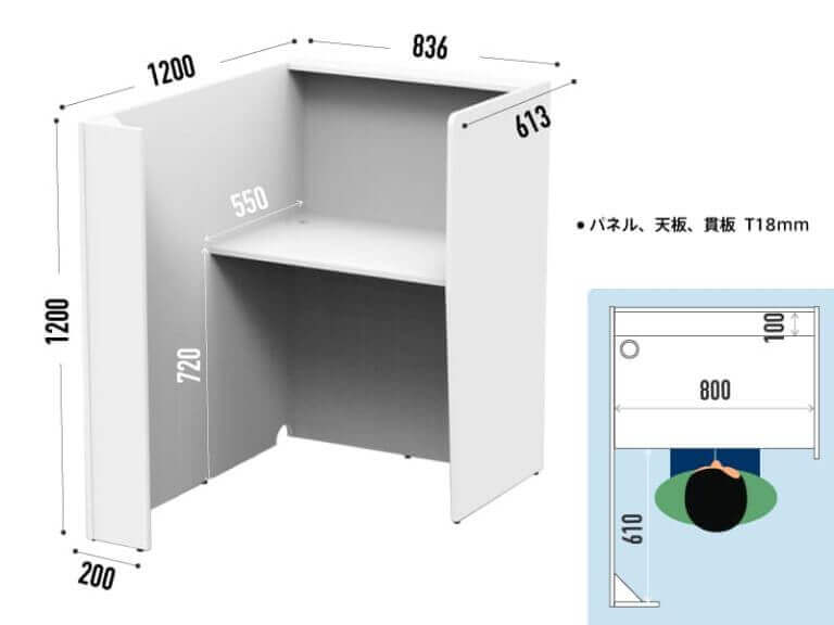 パネルの高さをH1200mmと低めに設定したコンパクトなパーソナルブース。部屋全体への圧迫感が少ないため天井の低いスモールオフィスや自習室にも設置しやすく、また使用時の閉塞感も抑えられ気軽に利用できます。