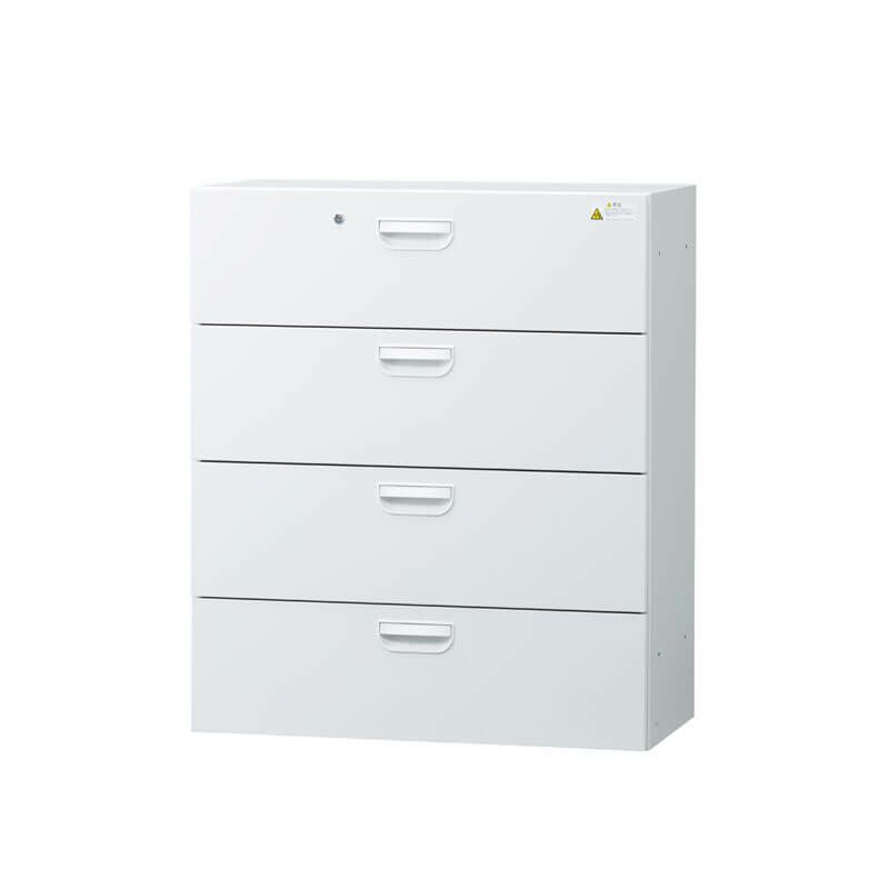 バリエーション豊富なシステム収納、HOSシリーズ。引き出しのストロークが大きく収納物が出し入れしやすくなっております。レバーを作動させない限りとびらや引き出しが開かない留め具(ラッチ)付。下置き用。単体でご使用になる場合は、別売りの壁固定用連結金具(RK-C)が必要です。ご使用になる際は、別売りのベース(HOS-BもしくはHOS-B-B)を設置してください。連結用のボルト・ナット・キャップが付属しています。 引き出し内寸:W818×D380×H202mm /横連結穴(φ8.5 丸穴)、上下連結穴(φ10.0 ハーフパンチ)、壁固定用穴(φ10.0 ハーフパンチ)*グリーン購入法適合商品