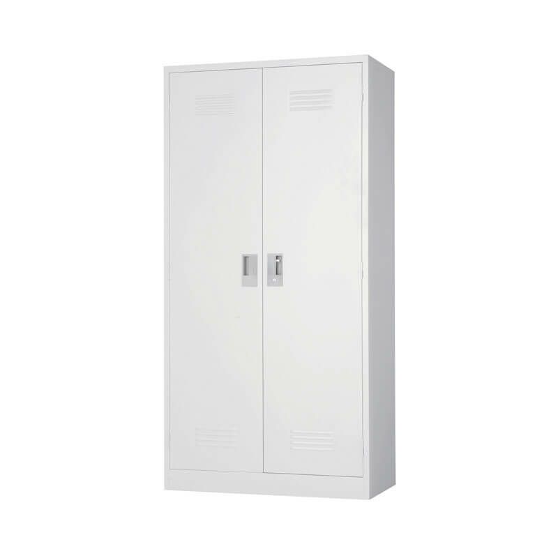 両開きタイプの掃除用ロッカー。レバーを引かない限り扉が開かない留め具(ラッチ)付。地震などの振動で扉が開く事を防止します。棚板のピッチは24mm。シリンダー錠(鍵2本付き)。トレー×2,トレー小×1、雑巾掛け×3、モップハンガー×5、バスケット大×1、バスケット小×2、可動棚4枚付属。 内寸:右)W390×D305×H1600mm 左)W390×D295×H棚上293/中間316/棚下321mm /扉寸法:右)W417×H1667 左)W421×H1667mm/スチール棚寸法:W426×D295mm/トレー寸法:W370×D435mm(外寸)W340×D405mm(内寸)