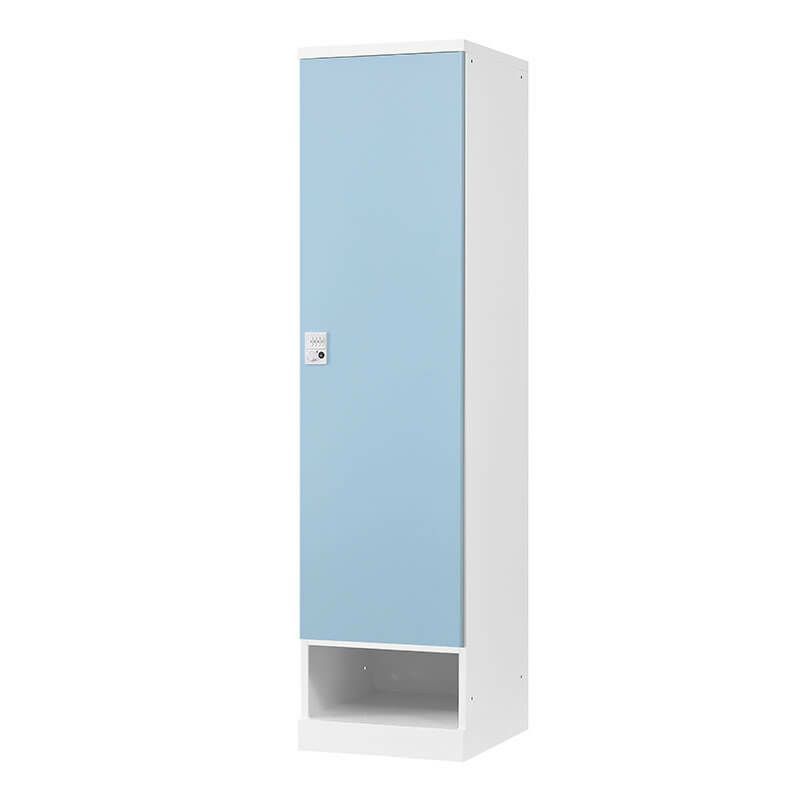 着替えるだけでなく小物・かばん・靴の収納にこだわった更衣用ロッカー。必要収納スペースに合わせハンガーパイプ位置の高さを2段階調整できます。棚は可動棚で、スペースを有効利用いただけるように高さを2段階調整できます。キーは、お好みの4桁の番号で施解錠するキーレスタイプのダイヤル錠です。扉が閉まった状態を保持できる留め具(キャッチ)付。