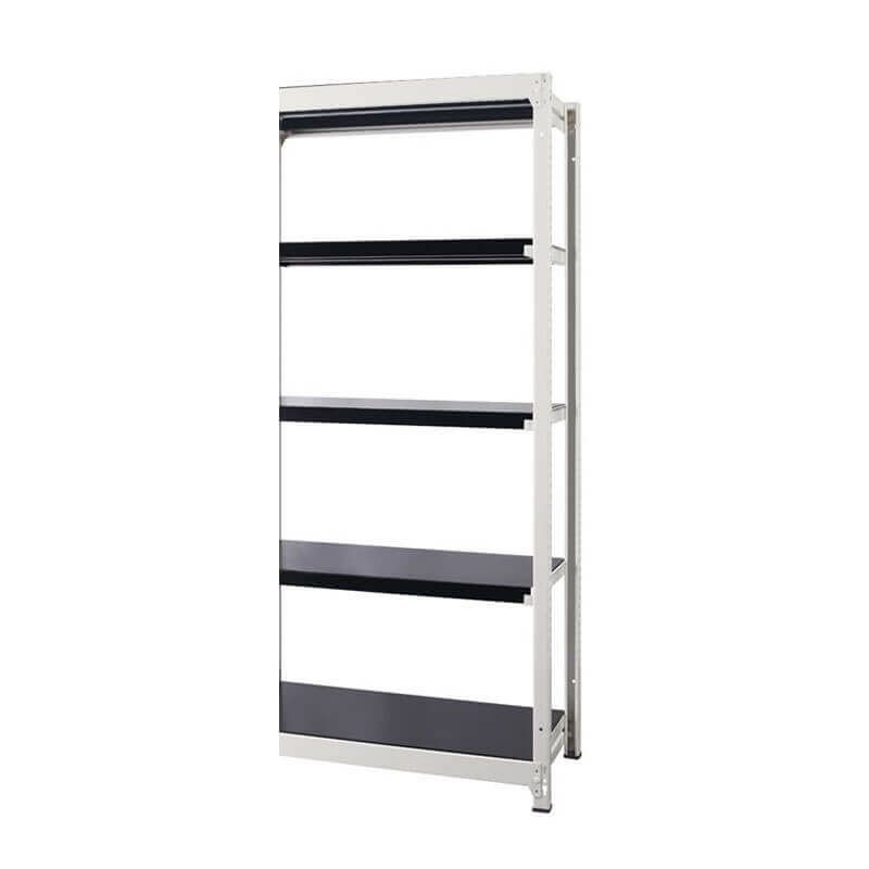 デザインにこだわったスチールラック増連セット。オールスチール製で1段あたり耐荷重200Kg(等分布)ボルトレスにより組立・分解も簡単。片側の支柱を利用し増連が可能。安全に配慮したコーナーキャップ付き。支柱2本・棚板5枚。