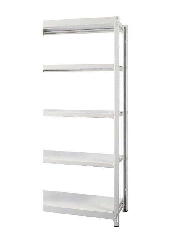 デザインにこだわったスチールラック増連セット。オールスチール製で1段あたり耐荷重200Kg(等分布)ボルトレスにより組立・分解も簡単。片側の支柱を利用し増連が可能。安全に配慮したコーナーキャップ付き。支柱2本・棚板5枚。