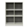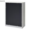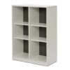 グレーの背板がスタイリッシュなプリーマシリーズの格子型シェルフ2列3段のグレー扉付き。棚板は上段が固定棚、可動棚板(ホワイト)が2枚付属。扉取手はシンプルなアルミ製、鍵2本が付属しています。背面化粧あり。間仕切りとしてもご利用いただけます。
