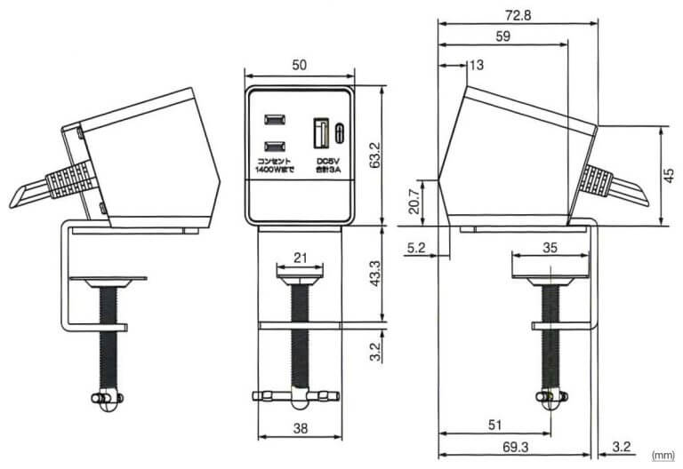 【商品説明】コンセント(1400W)とUSB(Type-A/Type-C)を搭載したマルチタップです。デスクやテーブル、カウンター等の天板にねじ式クランプで固定でき、手の届きやすい位置にコンセントが設置できます。 プラグはトラッキング防止スリーブ付きのL型プラグです。コンセント:100V屋内用、USB:入力100V屋内用、出力5V 3A(Type A/C合計)
