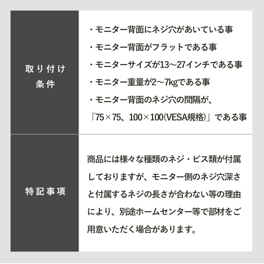 ・壁掛け用ネジ穴の間隔が75mmx75mm、100mmx100mmである事