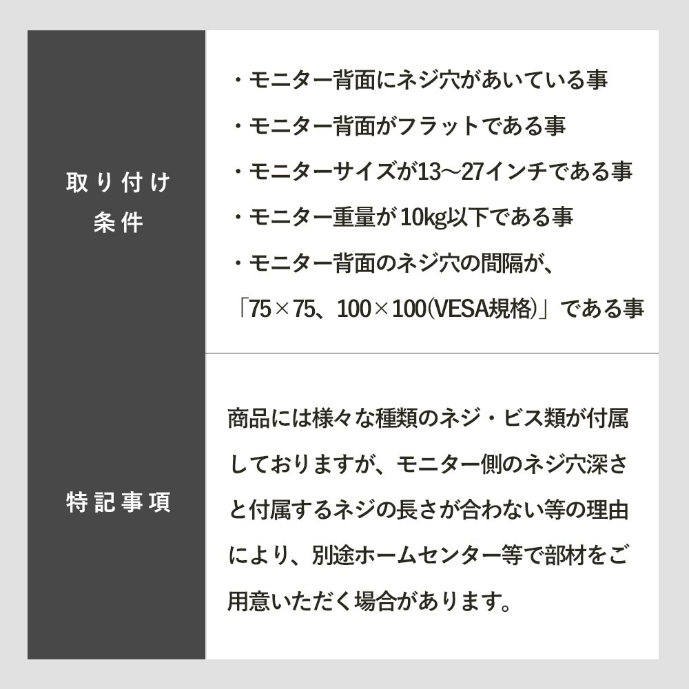 ・壁掛け用ネジ穴の間隔が75mmx75mm、100mmx100mmである事