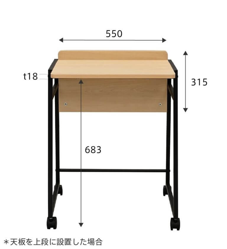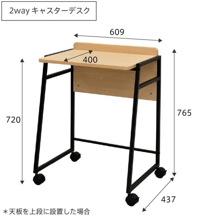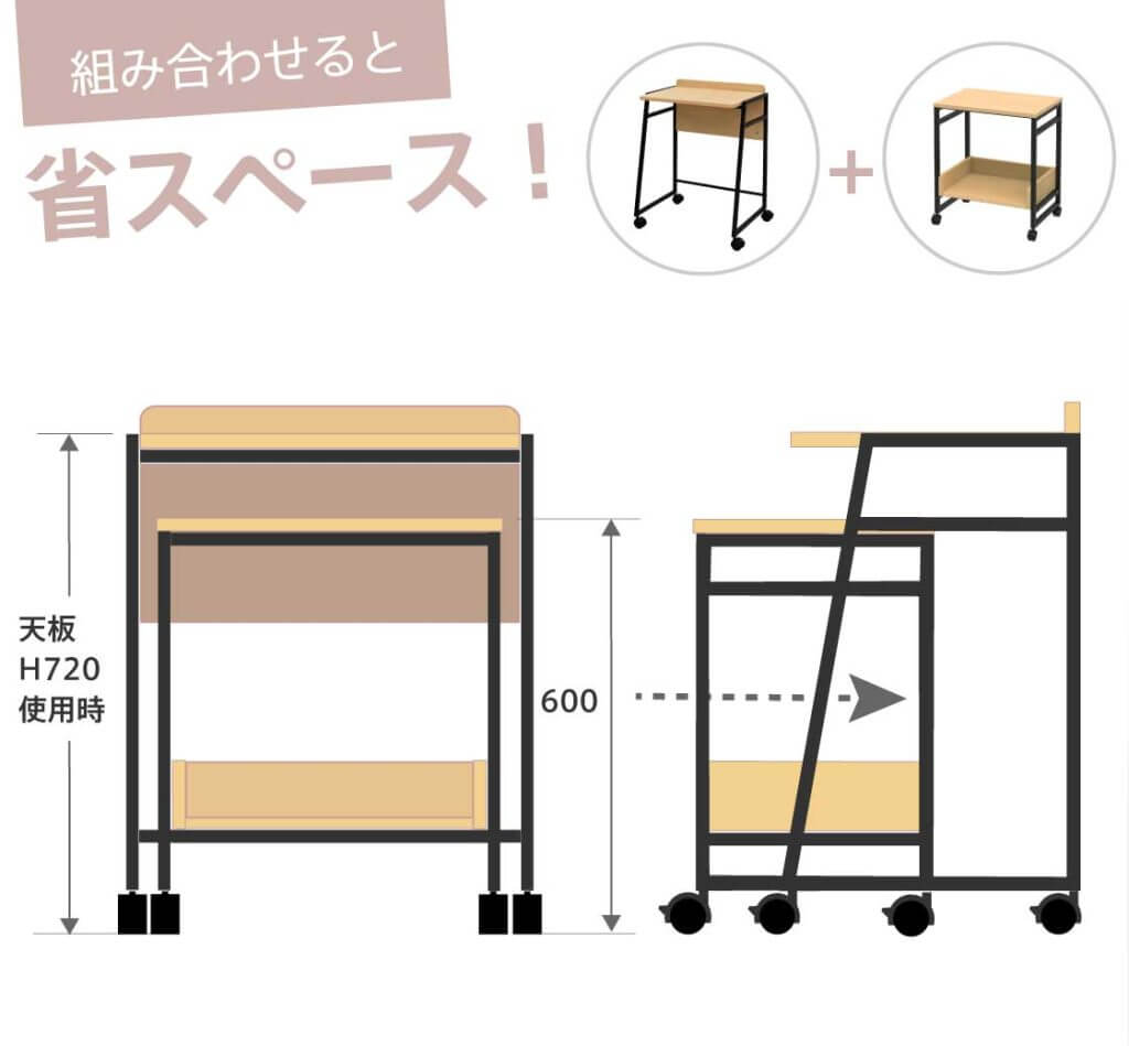 天板をH720mmにセットしたキャスターデスクは、天板下にキャスターシェルフを収納できます。デスクワークを終えたら重ねて収納しておくことで省スペースになります。 |