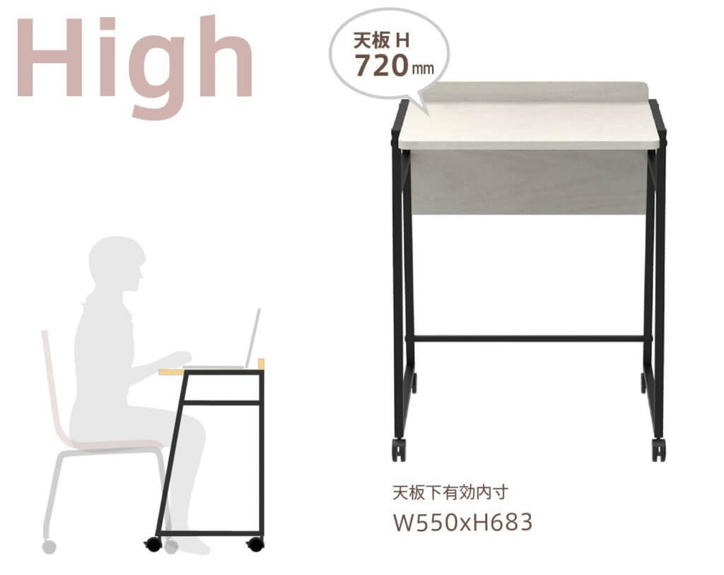 デスクチェアやダイニングチェアで使用する場合には、天板を上段のH720mmで固定することで、デスクワークに適した姿勢でご利用いただけます。キャスターシェルフが天板下に収納可能です。 |
