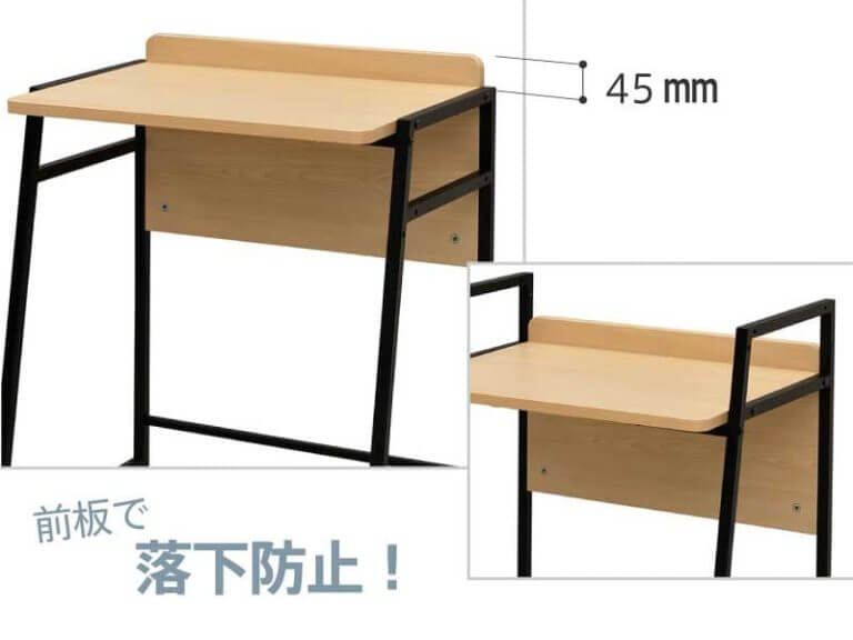 キャスターデスクの天板は前板を45mm立ち上げ、机上の物が天板奥へずり落ちないよう工夫されています。 |