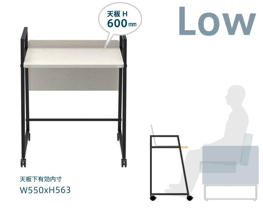 座面が低めの椅子やソファで使用する場合には、天板を下段のH600mmで固定してもご利用いただけます。脚部は手前側に角度をつけ、肘を広げてもぶつからないよう配慮しています。 |