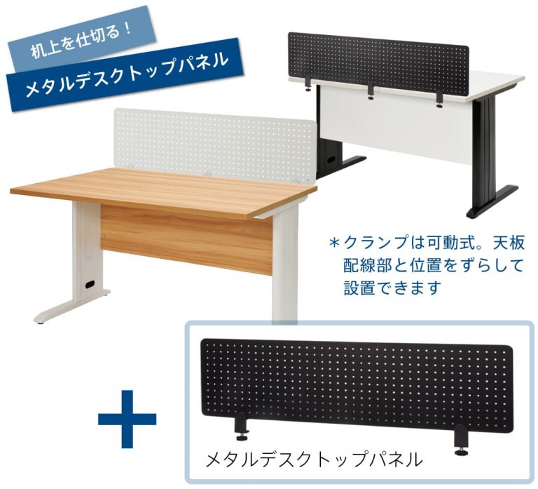 スチール脚と素材・色ともにマッチするメタルデスクトップパネルを合わせてご利用いただけます。 |