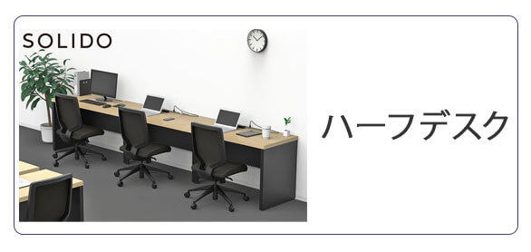 壁面設置など、非対面のデスクレイアウトに適したソリードのハーフデスク。対面式フリーアドレス用デスクの半分の奥行きで、基本は1人用の個別デスクや島型レイアウトのエンドデスクとしてご利用いただけます。増連は最大4台まで追加可能です。 |