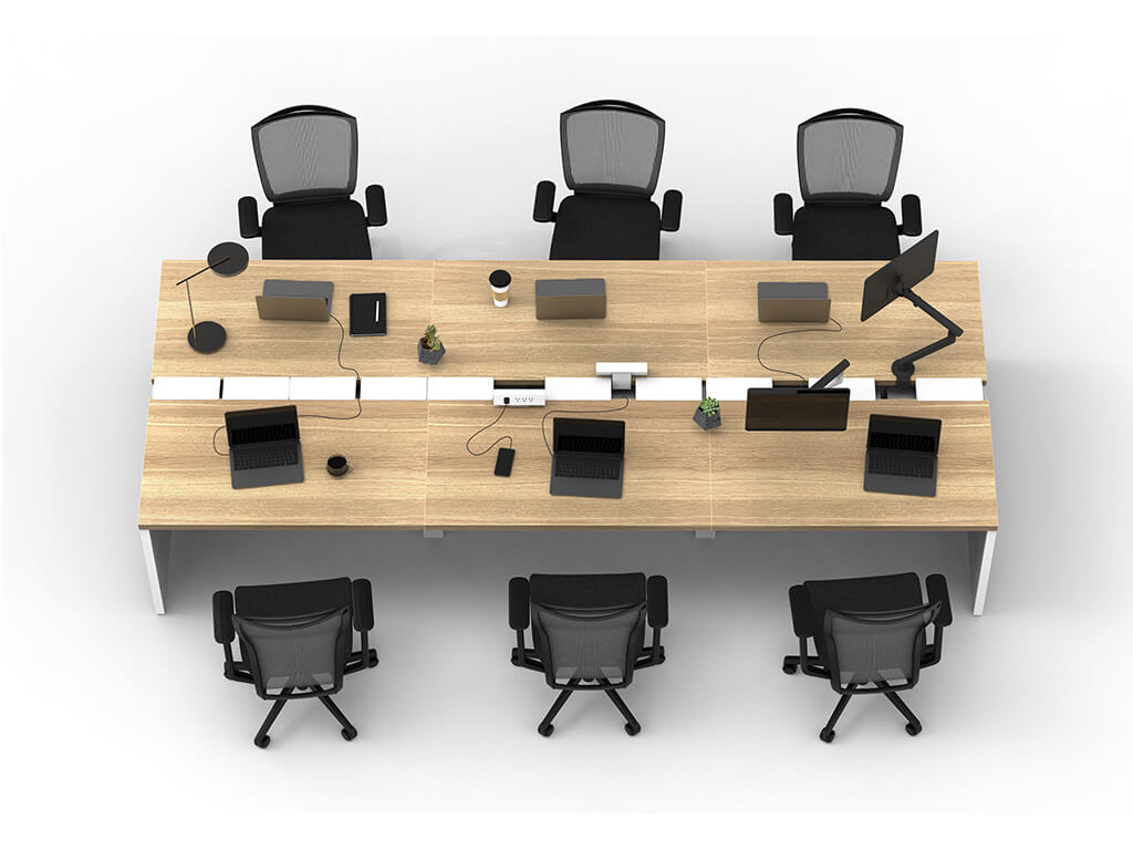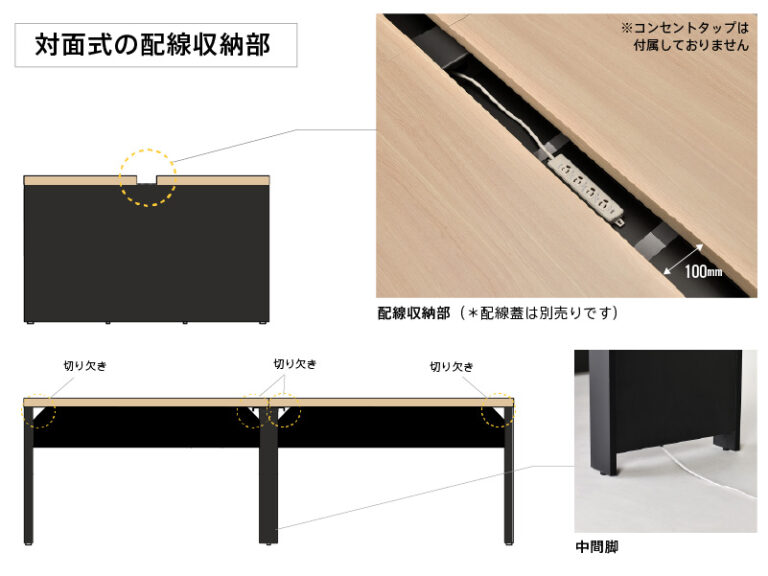 ソリードの対面デスクは、天板と天板の間に隙間を開けたデザインで、その下にスチールの配線受けがついており、市販のコンセントタップ等を収納できます。 |