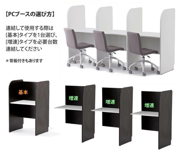 PCブースは、背板あり・なし共に、「基本」に「増連」を必要台数連結してご利用いただけます。増連は右側・左側どちら側でも可能です。 |