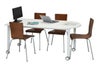 角形と円形が一体化したU字形天板のキャスターテーブル。角側を壁付けに配置したり、2台を組み合わせて長円形テーブルとしてもご利用いただけます。単体でご利用の際は、一方にモニターやホワイトボードを配置するなど同じ方向を見ながらのミーティング等に適しています。大型キャスター付きで移動もスムーズです。移動時以外はキャスターのストッパーをロックしてご使用ください。