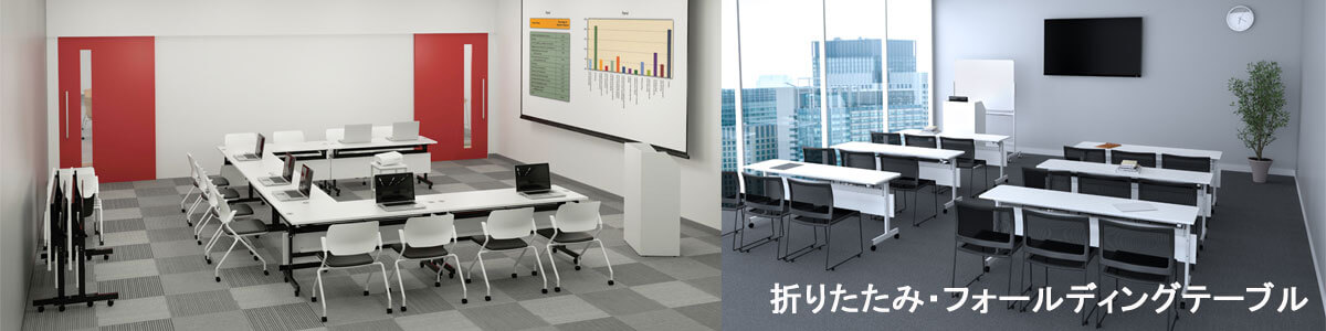 単体使いはもちろんスクールレイアウトやコの字、口の字型レイアウトにも便利な長机は、オフィスのミーティングルーム他、学校や貸し会議室にも最適。キャスター付きで移動やレイアウト変更が容易です。使わないときは折りたたんで収納でき、限られたスペースをフレキシブルに活用できます。