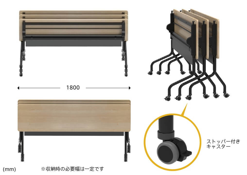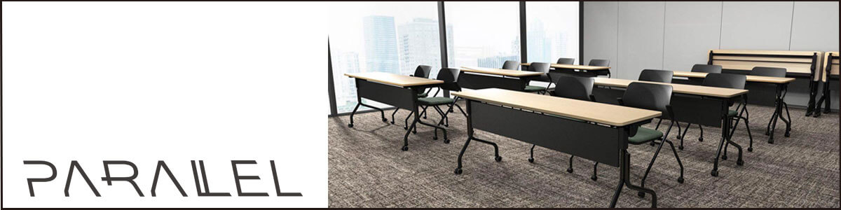 パラレルシリーズのフォールディングテーブルは、平行スタッキングでコンパクトに収納できるスタイリッシュな会議用テーブル。スタック収納時には天板両サイド下にあるレバーのどちらかを押し上げながら天板を折り畳んでください。