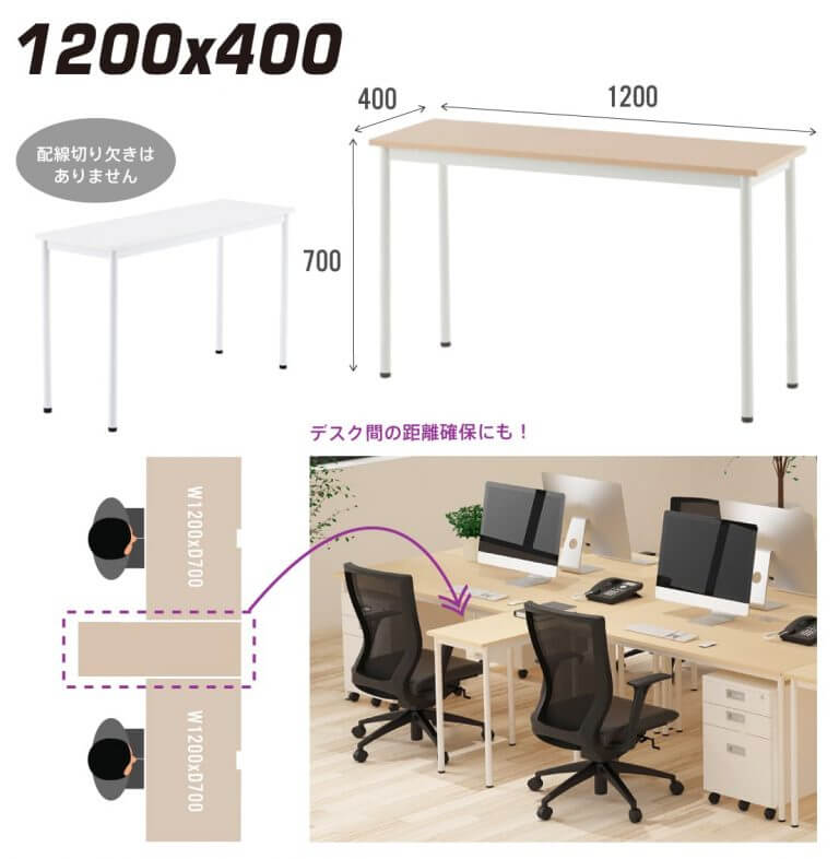 W1200xD400は、切り欠き無しのスリムな長机タイプ。組み合わせでL字に天板を拡張できる他、2つの席の境界に置けば隣と適度な間隔を保てます。 |