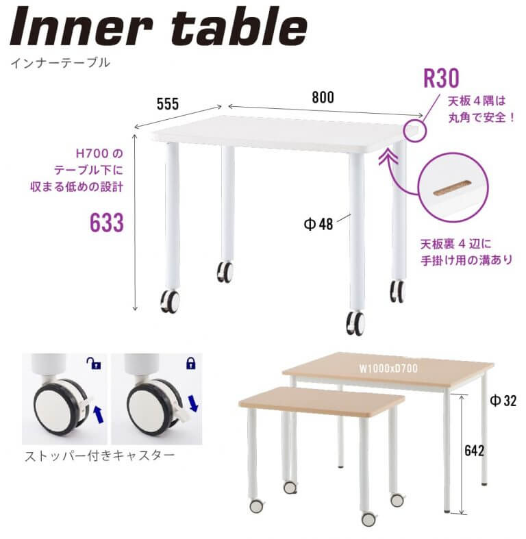 サイドテーブルとしても役立つキャスター付きインナーデスク。このタイプのみR30の丸角設計、天板裏に手掛け用の溝があり引き出しやすいよう配慮されています。 |