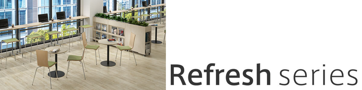 オフィスの休憩室やロビー、リフレッシュ空間やカフェスペースで活躍するリフレッシュシリーズテーブル。1本脚の丸天板、スクエア天板から、ソファサイドに適したサイドテーブル、カウンターテーブルとしてご利用いただけるハイテーブルまで、バリエーション豊富に取り揃えています。