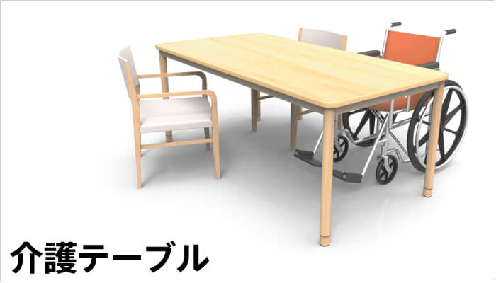 介護・福祉系施設、医療シーンなど、車椅子での利用にも適したケアシリーズの介護用テーブル。丸角天板とソフトエッジの安全設計、脚部に取り付けるスペーサーで天板の高さを2段階で調節できます。