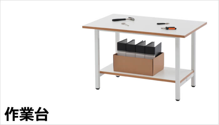 頑丈な脚部構造と厚みのある天板で作業に適したシリーズ。通常のテーブルよりも天板Hが高めのワークテーブルです。