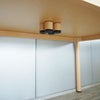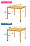 付属のスペーサーで高さ690mmと741mmの2段階高さ調節が可能です。テーブル幕板下内寸はスペーサー使用時666mm、スペーサー未使用時615mm、脚間内寸は764mmとなっており、スペーサーをご使用頂くと、肘掛けの高さ666mm未満・幅764mm未満のチェア・車椅子が入ります。使用しないスペーサーは天板裏に取り付けでき紛失を防止します。脚部は丈夫なスチール製、木目シート貼りです。